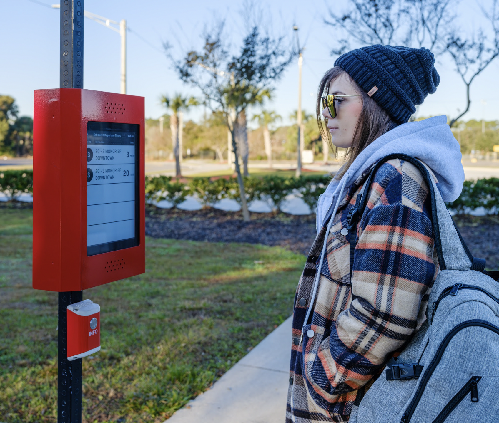 Female passenger looking at a 13-inch vandal-resistant e-paper display with push-to-talk button, showing real-time bus arrival information at a transit stop.